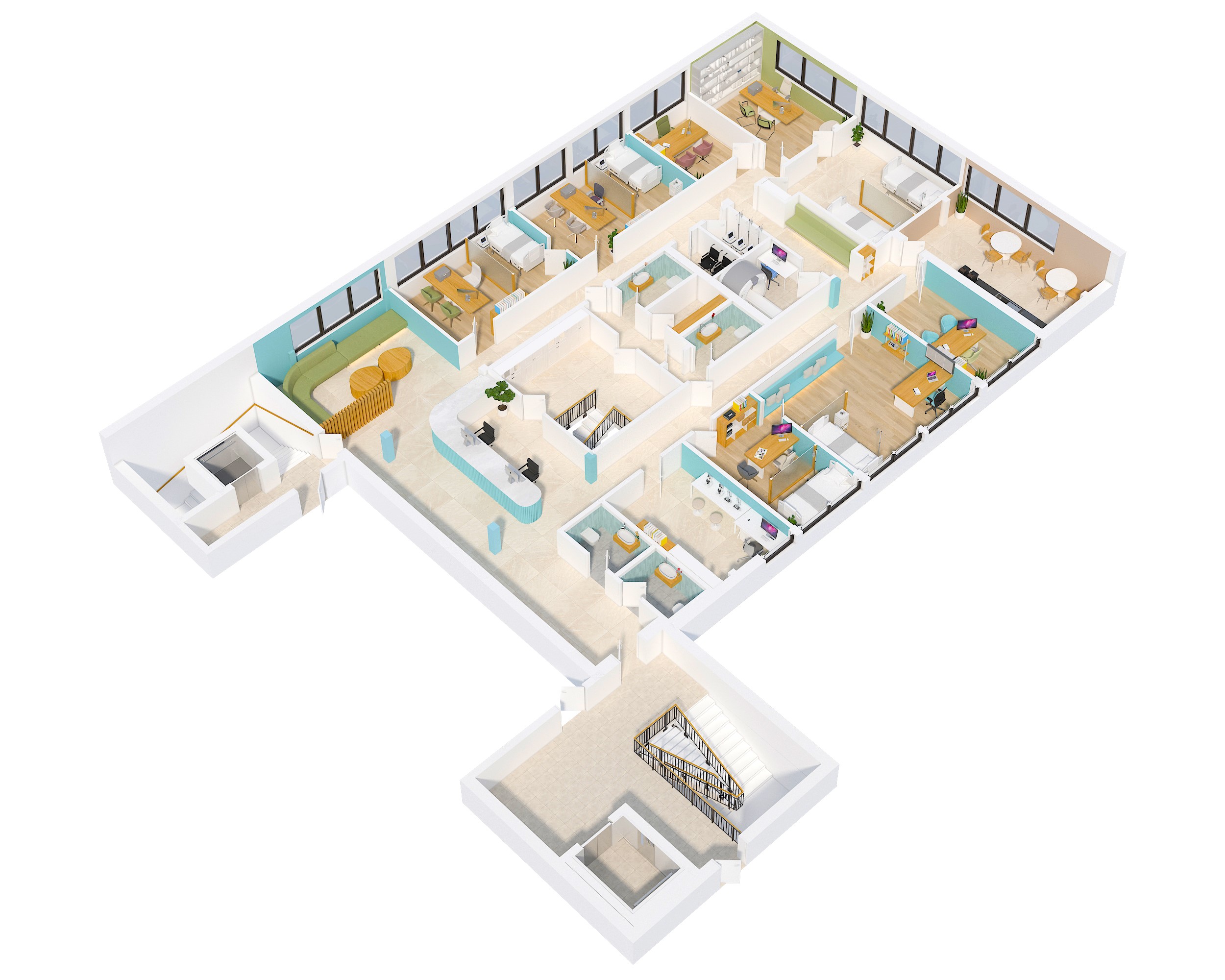 Das Gesundheitszentrum ist architektonisch fein und praktisch geplant. Es wurde ein ansprechendes Design und Farbkonzept gewählt. Große Fensterflächen sorgen für eine helle und einladende Atmosphäre, während der gehobene Ausstattungsstandard den Anforderungen medizinischer Praxen gerecht wird.