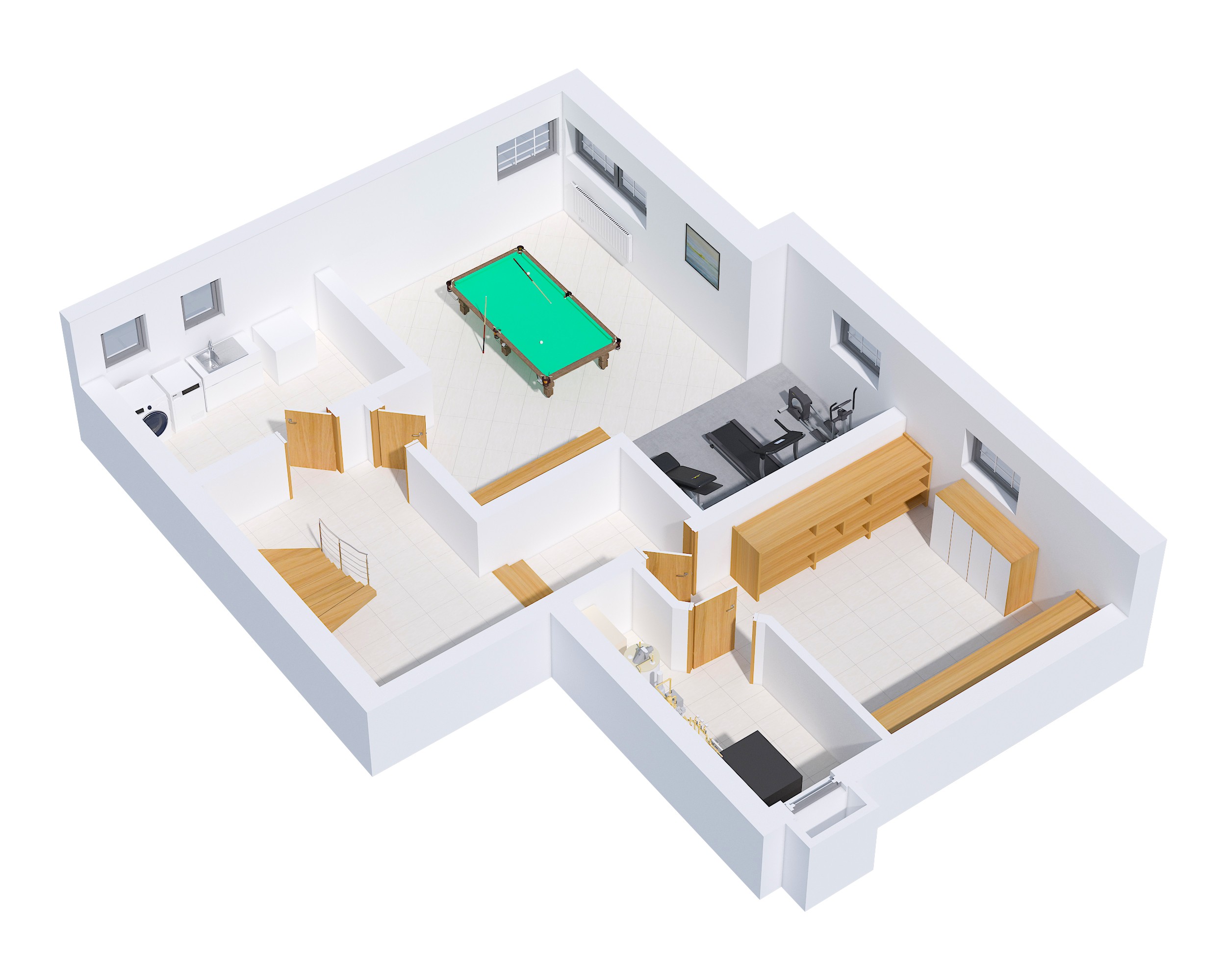 Im Souterrain erwartet Sie ein großzügiger Hobbyraum, der sich dank aller Anschlüsse auch als Einliegerwohnung eignet. Zusätzlich stehen eine Waschküche, ein großer Lagerraum sowie der Technikraum mit Heizanlage zur Verfügung.